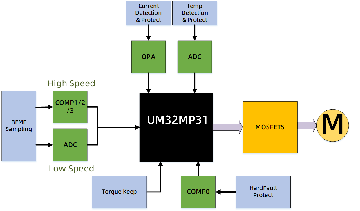 ADC反電勢獲取(低速)+內置3路比較器(高速)切換控制